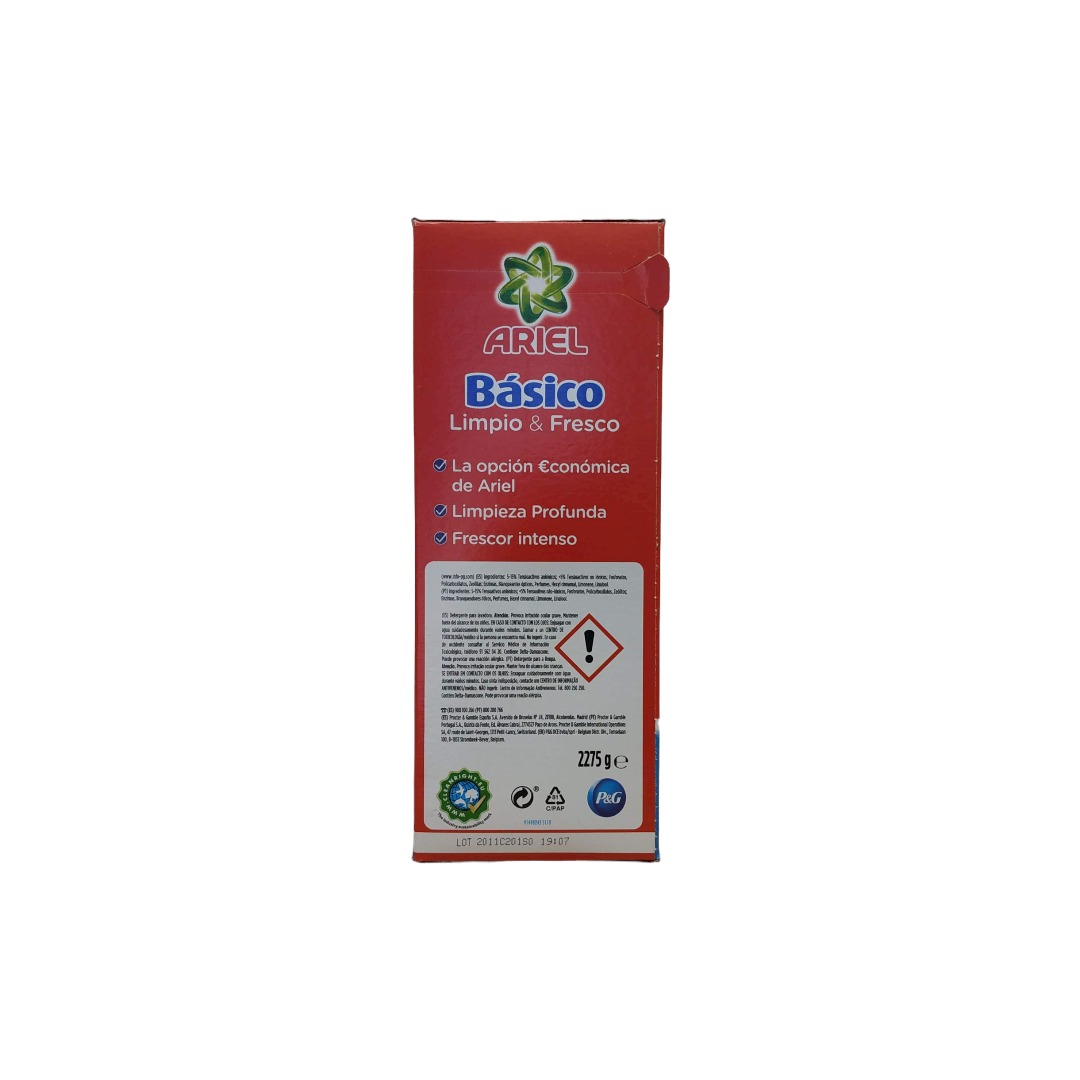Ariel Polvo Básico 35 Lavados es un práctico detergente para la lavadora que se va a convertir en todo lo que necesitas para eliminar la suciedad y grasa que pueden ser causantes de malos olores, dejando tu colada limpia y fresca. Además de ofrecer una limpieza en profundidad, este detergente tiene un fresco e intenso aroma que sentirás agradablemente en tus prendas.