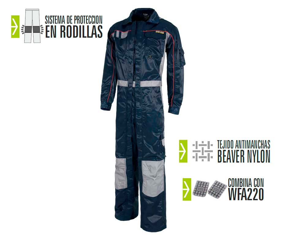 Monos de trabajo antimanchas. Buzo recto de trabajo con refuerzos y triple costura en tejido Beaver Nylon de alta resistencia, antimanchas y repelente a líquidos. Buzo con sistema de protección y refuerzo con cierre de velcro para rodilleras de protección. Multibolsillos. Con 2 cremalleras. Detalles combinados. Sistema de protección en rodilleras. Buzo ideal para industria, albañiles, construcción, fontaneros, electricistas, carpinteros, mecánicos, camioneros y fábricas.