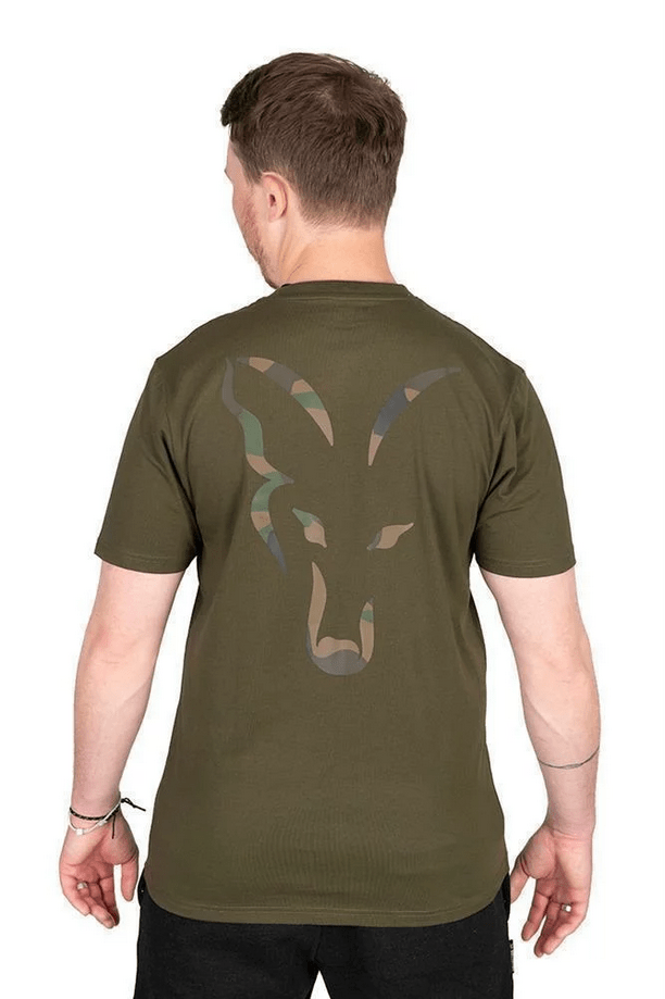 La Camiseta Fox Large Print Kaki/Camo es una prenda versátil en color caqui, con un diseño llamativo. Presenta un logotipo en el pecho con estampado de camuflaje y la icónica cabeza de zorro de Fox.