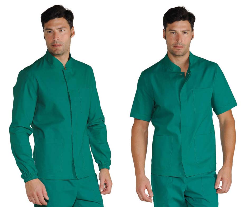 Casaca sanitaria algodón de hombre disponible en manga corta o manga larga en distintos colores a elegir. Casaca sanitaria de diseño moderno, cuello Mao y cierre con corchetes a presión oculto. Tres bolsillos. Modelo Isacco Corfu. Pensada para uso profesional en sanidad, auxiliares enfermería, veterinarios, dentistas, ópticas, farmacias, clínicas y hospitales. Prenda corte semi-ajustado. Medida de la prenda estirada en plano de axila a axila: