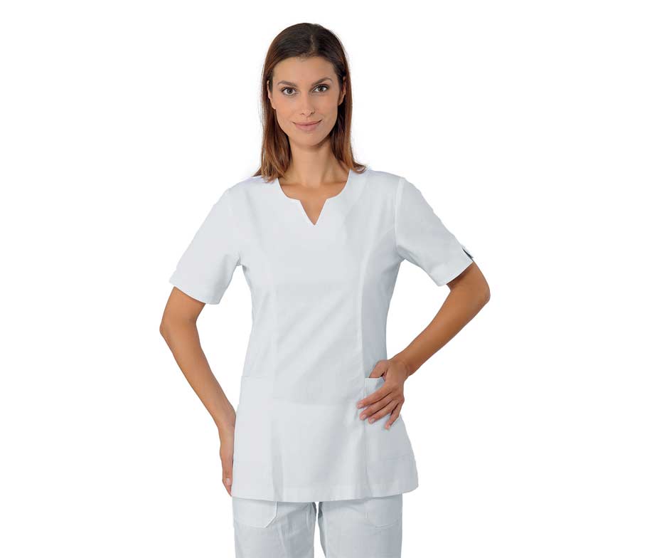 Pijama sanitario 100% algodón. Casaca sanitaria mujer entallada y manga corta cuello pico y con 2 bolsillos. Modelo Isacco Tiffany. Esta casaca sanitaria es ideal para los centros que necesiten uniformes sanitarios elegantes confeccionados en tejido 100% algodón para enfermeras, clínicas, farmacéuticas, dentistas, centros de estética, ópticas, veterinarias, cocineras, y personal de comercios y hospitales en general.