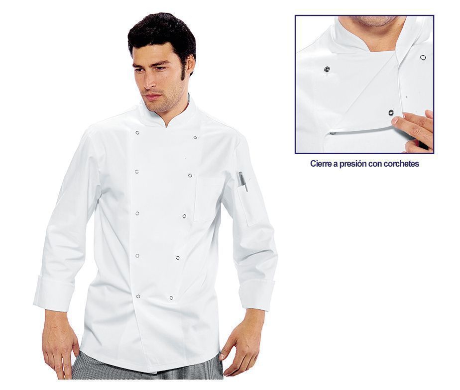 Chaqueta de cocina de manga larga con cierre a presión con 10 corchetes. Tejido 100% algodón. 2 bolsillos. Casaca de cocinero de gran calidad y confort. Demuestra el auténtico Master Chef que eres.