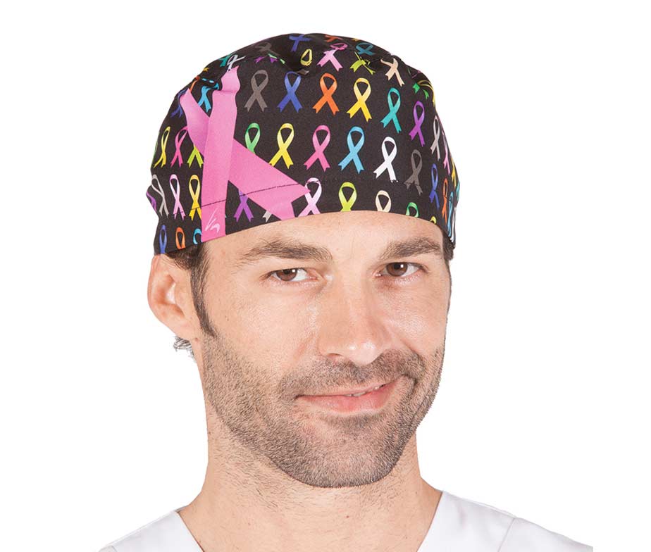 Gorros Quirófano Solidarios lucha contra el cáncer para uniformes sanitarios microfibra, dentistas, matronas, veterinarios, enfermeras y enfermeros, pediatras, oncólogos, cirujanos, uniforme auxiliar de enfermería, masajistas, centros de belleza, spas, balnearios, centros de estética o ropa de trabajo sanitarios o cuidadores en general. Gorro sanitario con tejido absorbente para sudoración en el frontal interior. Todos los estampados disponibles en gorro quirófano mujer con elástico goma para pelo largo y gorros quirófano hombre o pelo corto con tiras de ajuste traseras. Gorro bandana pirata de cirujano unisex en tejido microfibra: antibacterias, repelente a los líquidos, muy transpirable, no necesita plancha, tolerante a salpicadura de lejía. Soporta lavados a 90 grados.