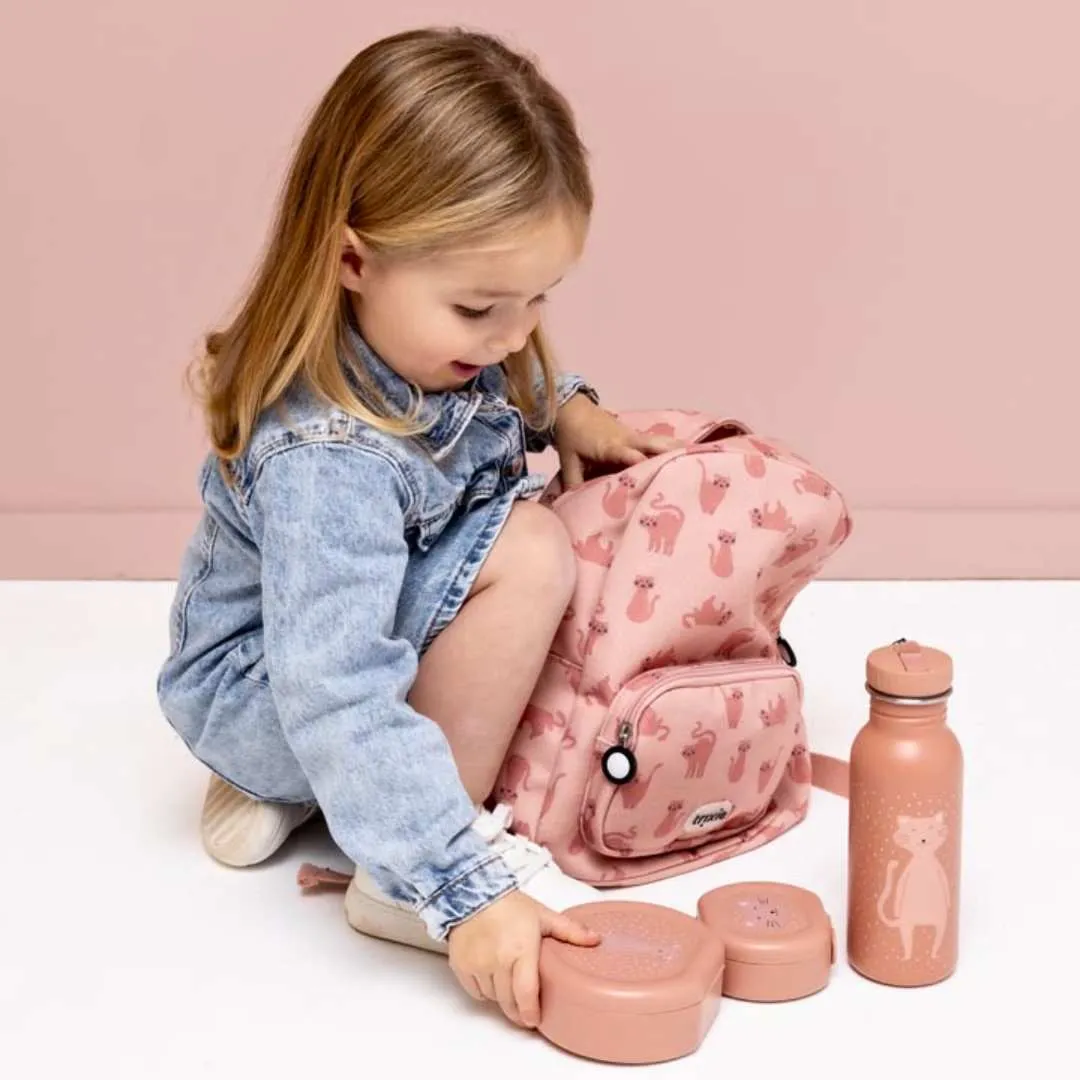 La mochila Charming Cat está diseñada para adaptarse a las necesidades de los más peques. Cuenta con un amplio compartimento principal que ofrece suficiente espacio para la caja de almuerzo, libros y cualquier tesoro que recojan en su camino. Además, incluye un bolsillo frontal ideal para guardar pequeños objetos, así como un bolsillo especial para la botella, asegurando que tu hijo se mantenga hidratado durante sus actividades.