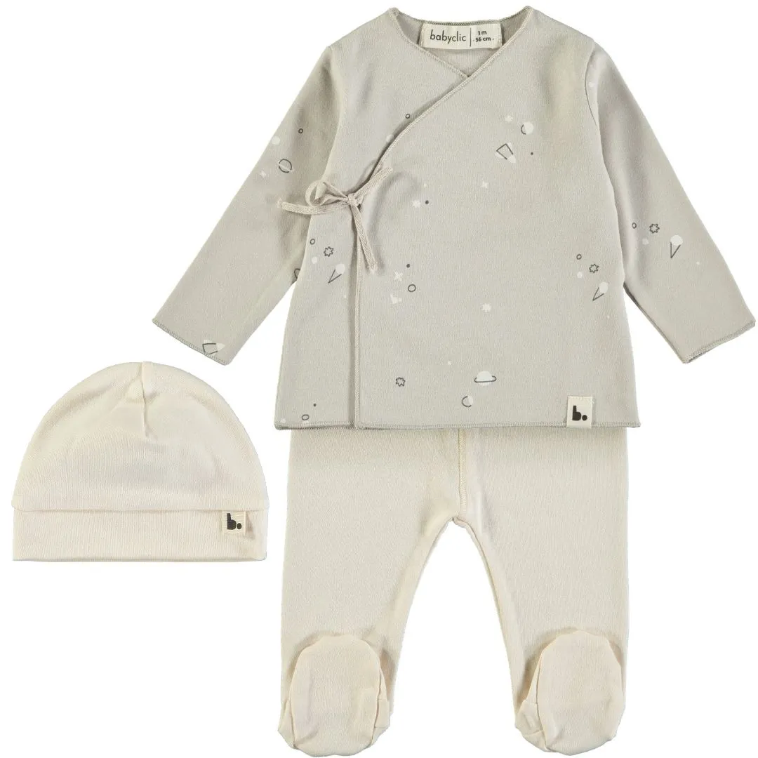 El diseño en un precioso y suave color verde, es elegante y atemporal, perfecto para cualquier ocasión especial. La camiseta cruzada es fácil de poner y quitar, lo que facilita el cambio de pañales y la vestimenta de tu bebé. El pantalón con pies mantendrá sus piececitos calientes y protegidos, mientras que el gorrito con orejitas le dará un toque extra de dulzura y estilo.