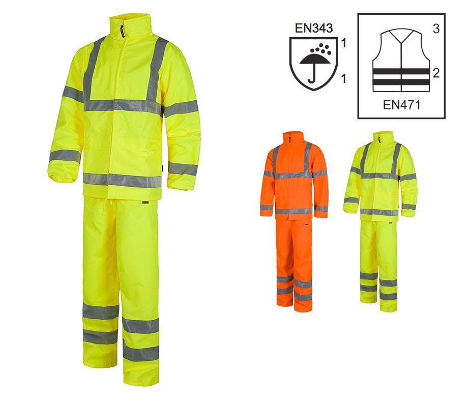 - Conjunto de alta visibilidad de pantalón y chaqueta impermeables. EN471. EN343.